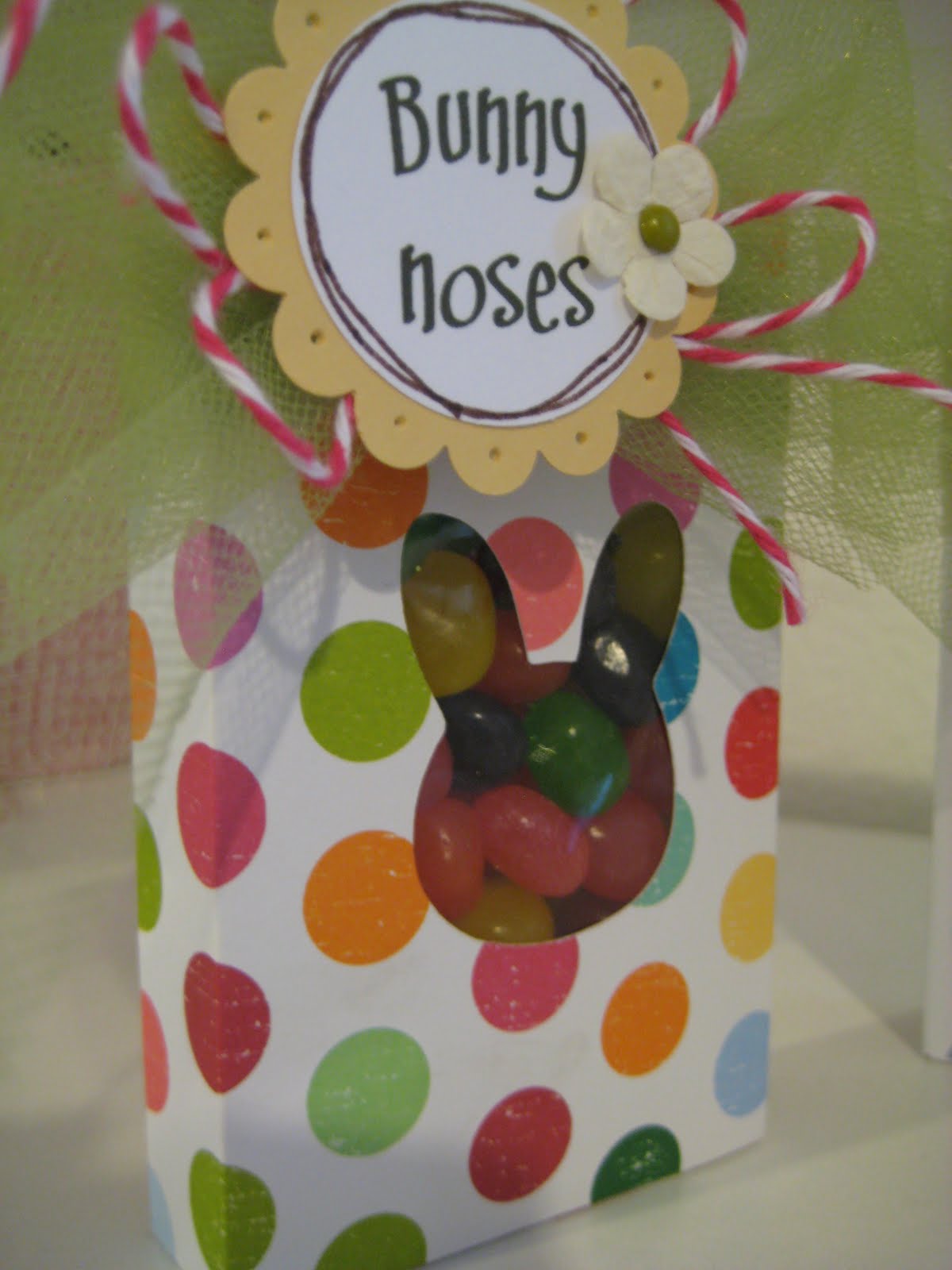 Before you glued the cute little box together you want to put something over the bunnies so that the jelly beans I mean Bunny noses don't fall out! I use pieces of packaging that I have in my stash. This piece was from a set of Halloween pins.